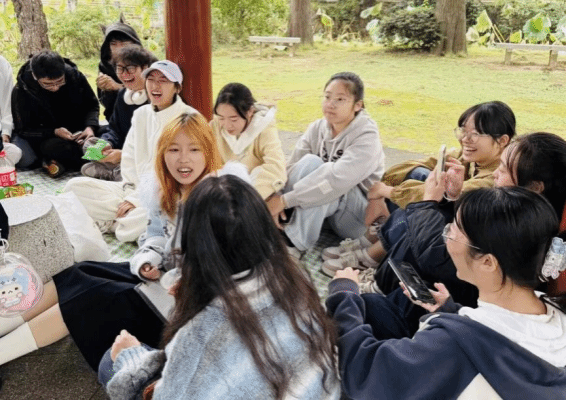 游戏过后,现场氛围转入温馨。同学们围坐凉亭内敞开心扉,不再有平日课堂的拘谨,互相分享自己的烦恼与身边的趣事。讲述者畅所欲言,倾听者认真回应,在彼此的倾诉与慰藉中,学业与生活的压力悄然释放,真挚的同学情谊在交流中不断升温。