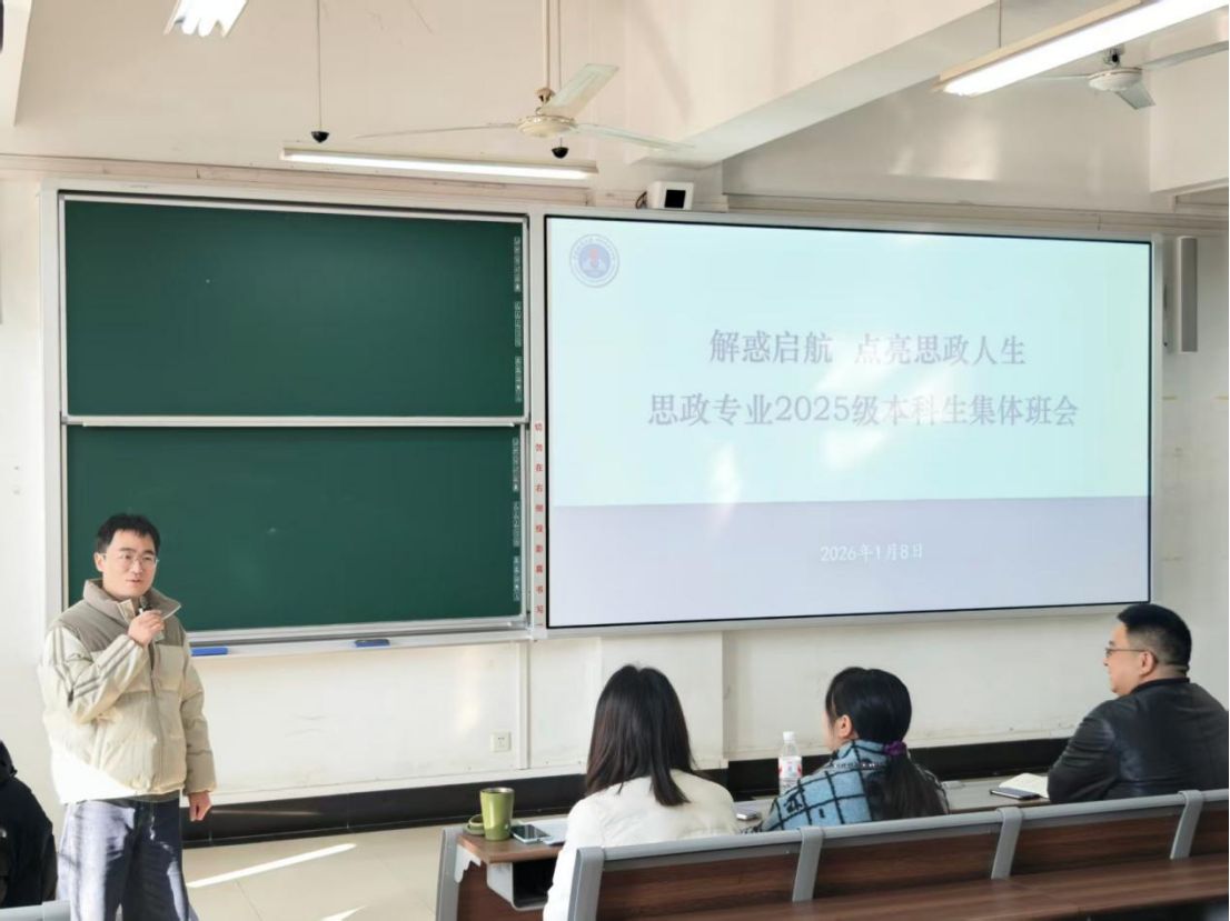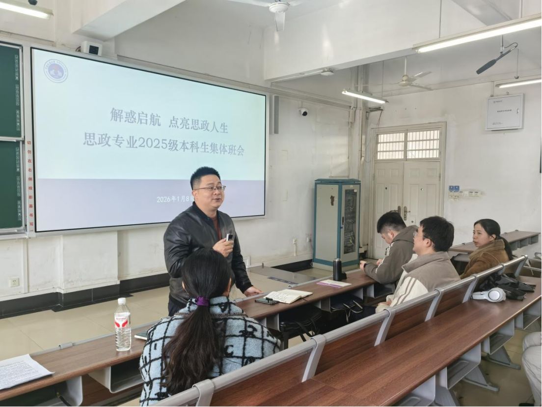 (通讯员:李胜蓝 何晓龙)1月8日上午10时,Bwin必赢思想政治教育系在北区教学综合楼202室举行2025级新生集体班会。本次班会以“解惑启航 点亮思政人生”为主题,旨在引导新生深化专业认知、锚定发展方向。学院副院长陈军、思政领航党支书记曹阳、系主任李胜蓝、副主任何晓龙、2025级班主任及全体本科学生参会。会议由何晓龙主持。